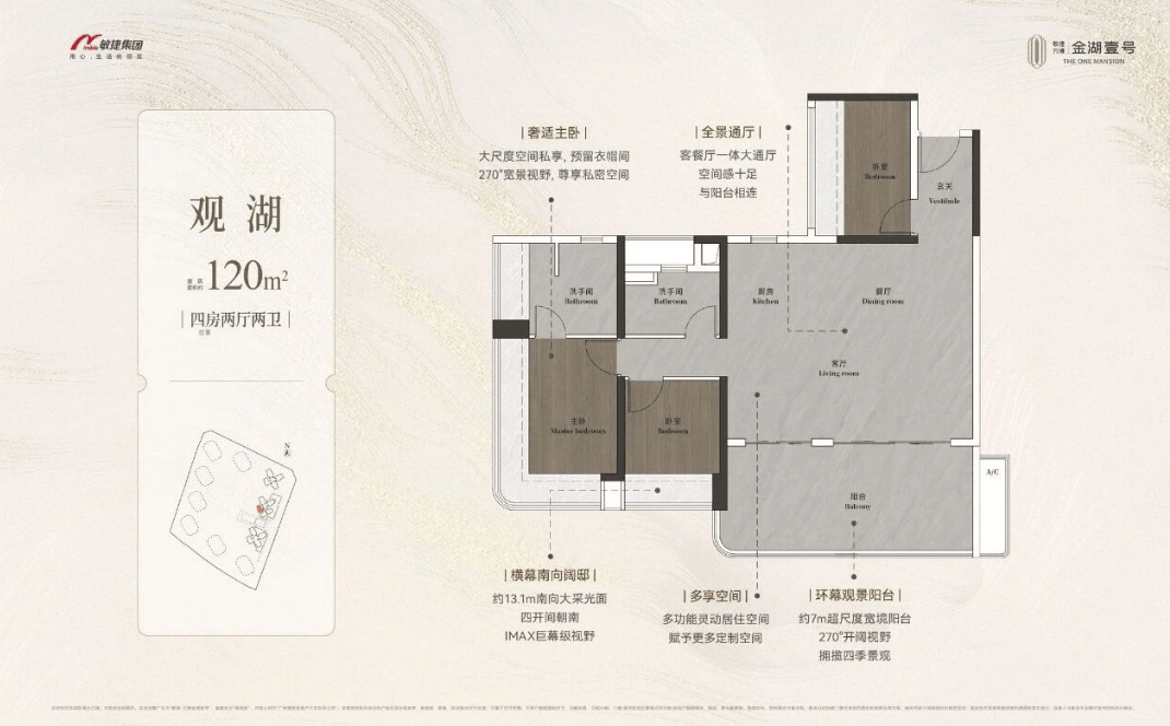 南北双阳台设想,适用性极强,南朝阳台可做为景不雅阳台,摆放休闲桌椅、种植绿植,赏识湖景取园林美景;北朝阳台可做为糊口阳台,用于晾晒衣物、存放杂物,实现景不雅取适用的完满连系。同时,双阳台的设想也能进一步提拔室内的通风结果,让栖身愈加舒服。空间宽阔,私密性强,能为业从供给舒服、便利的栖身体验。衣帽间可满脚业从的衣物收纳需求,摆放衣物、鞋子、配饰等,让室内愈加整洁有序;卫生间配备浴缸、淋浴等设备,业从可正在忙碌一天后,享受舒服的洗澡光阴,缓解委靡。